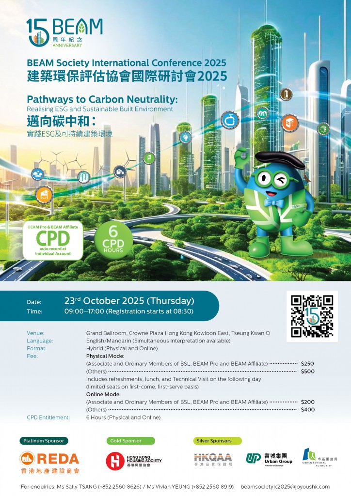 Heading to its 15th Anniversary, BEAM Society Limited (BSL) is commemorating this notable milestone by organising the BEAM Society International Conference 2025, which serves as a key platform to promote sustainable development practices and investment strategies. Themed “Pathways to Carbon Neutrality: Realising ESG and Sustainable Built Environment!”, the Conference will deliberate on the Environmental, Social, and Governance (ESG) implementations, including discussions on green finance advancement, digital transformation, artificial intelligence for building life cycle, and green assessment tools and certification. Remarkable green advocates and academics will share international case studies, further advancing our mission to creating a more sustainable built environment for the community and achieving the carbon neutrality goal set out in Hong Kong's Climate Action Plan 2050. The Conference will definitely facilitate the connectivity and deepen collaborations across the Greater Bay Area region, creating synergies that align with the Mainland’s shared sustainability objectives. These efforts are fully aligned with the goals outlined in the Chief Executive’s Policy Address 2024.
