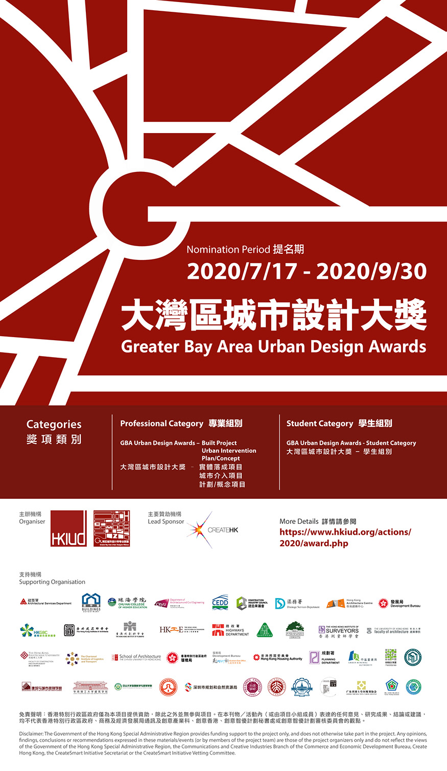 The Awards will be held as a biennial event. This year, the debut GBA Urban Design Awards 2020 is organised by the Hong Kong Institute of Urban Design with the support of other member institutes from Greater Bay Area Urban Designer Alliance and sponsorship from Create Hong Kong (CreateHK) of the Government of the Hong Kong Special Administrative Region. Urban design professionals and organisations in the GBA are invited to nominate urban design projects to participate in the GBA Urban Design Awards from 17 July 2020 to 30 September 2020. To establish the credibility of the GBA Urban Design Awards, renowned academia and practitioners in urban design will be invited to be the jury members and jury’s adjudication would take place from October to November this year.